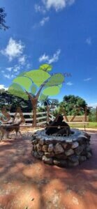 Ali de frente tem um laguinho ornamental com cascata e belos jardins pra admirar. Tem peixes, ponte pra atravessar, iluminação e um banquinho pra sentar!