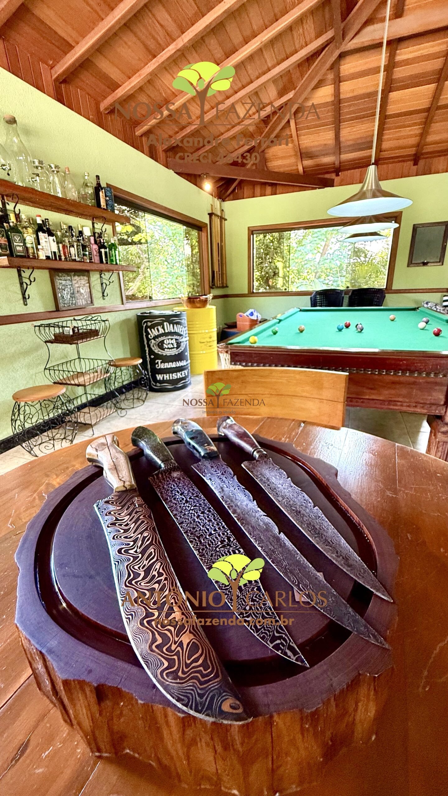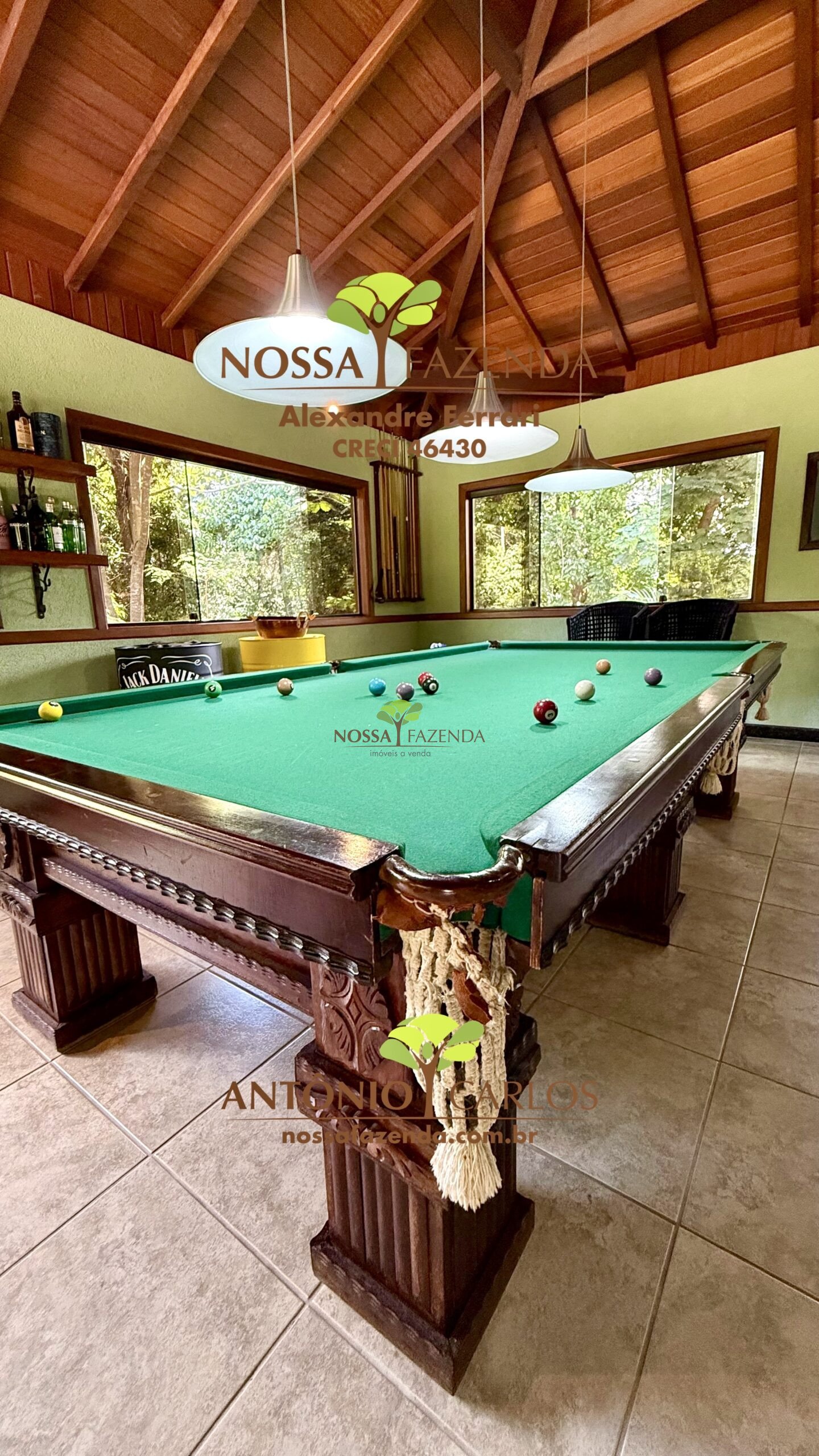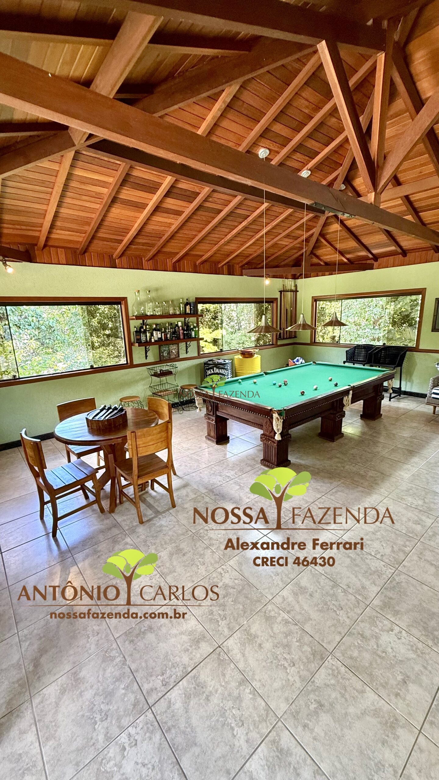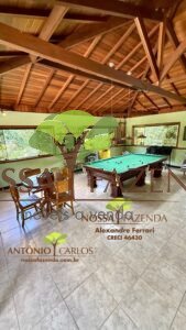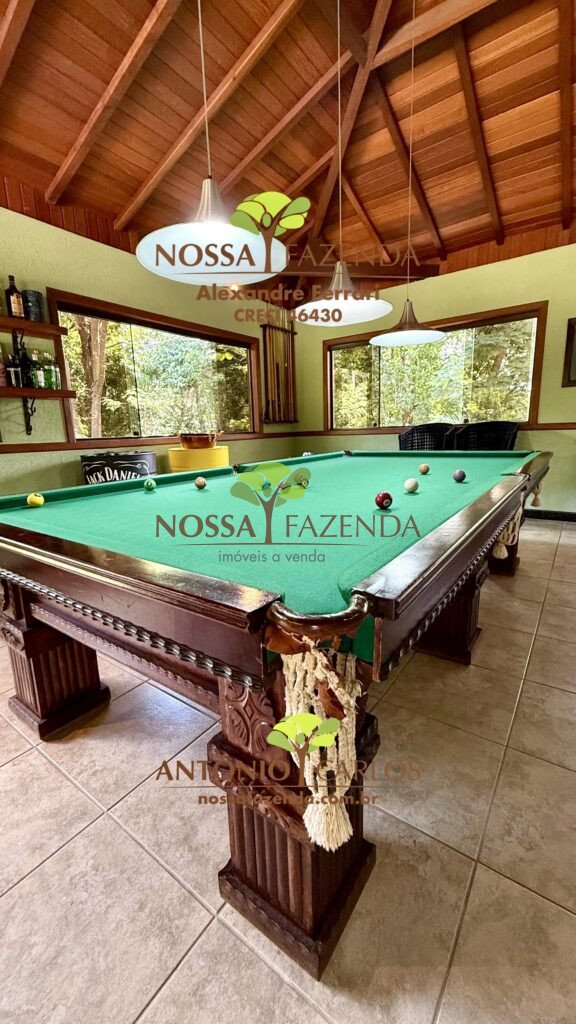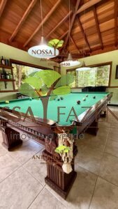 Salão de jogos com sinuca e mesa para carteado, bar interno, banho completo e vista para a piscina com cascata que é AQUECIDA!!