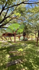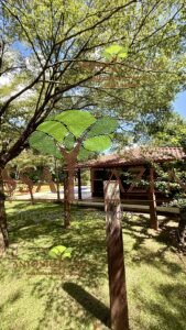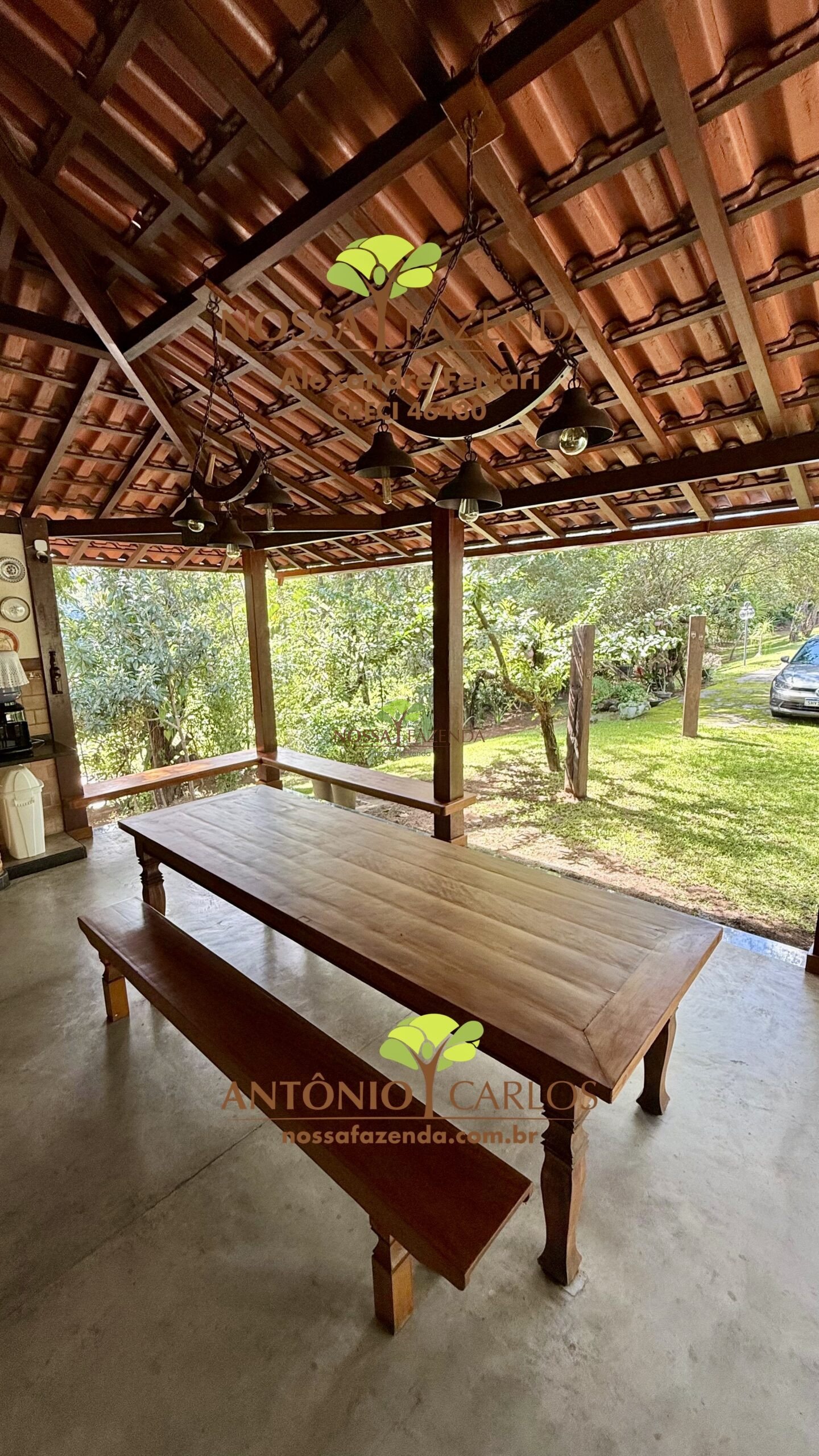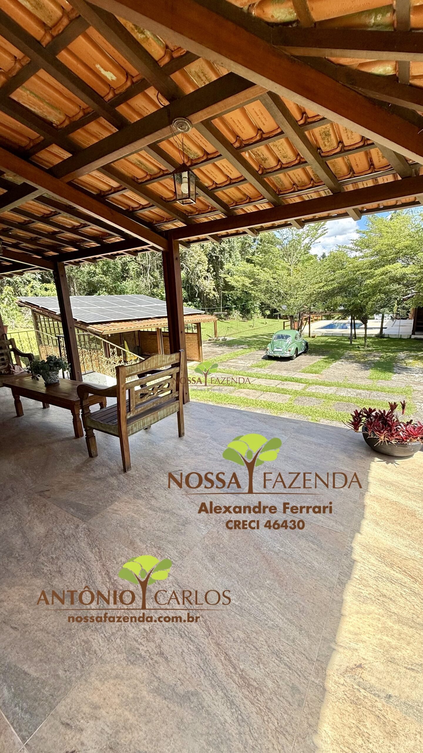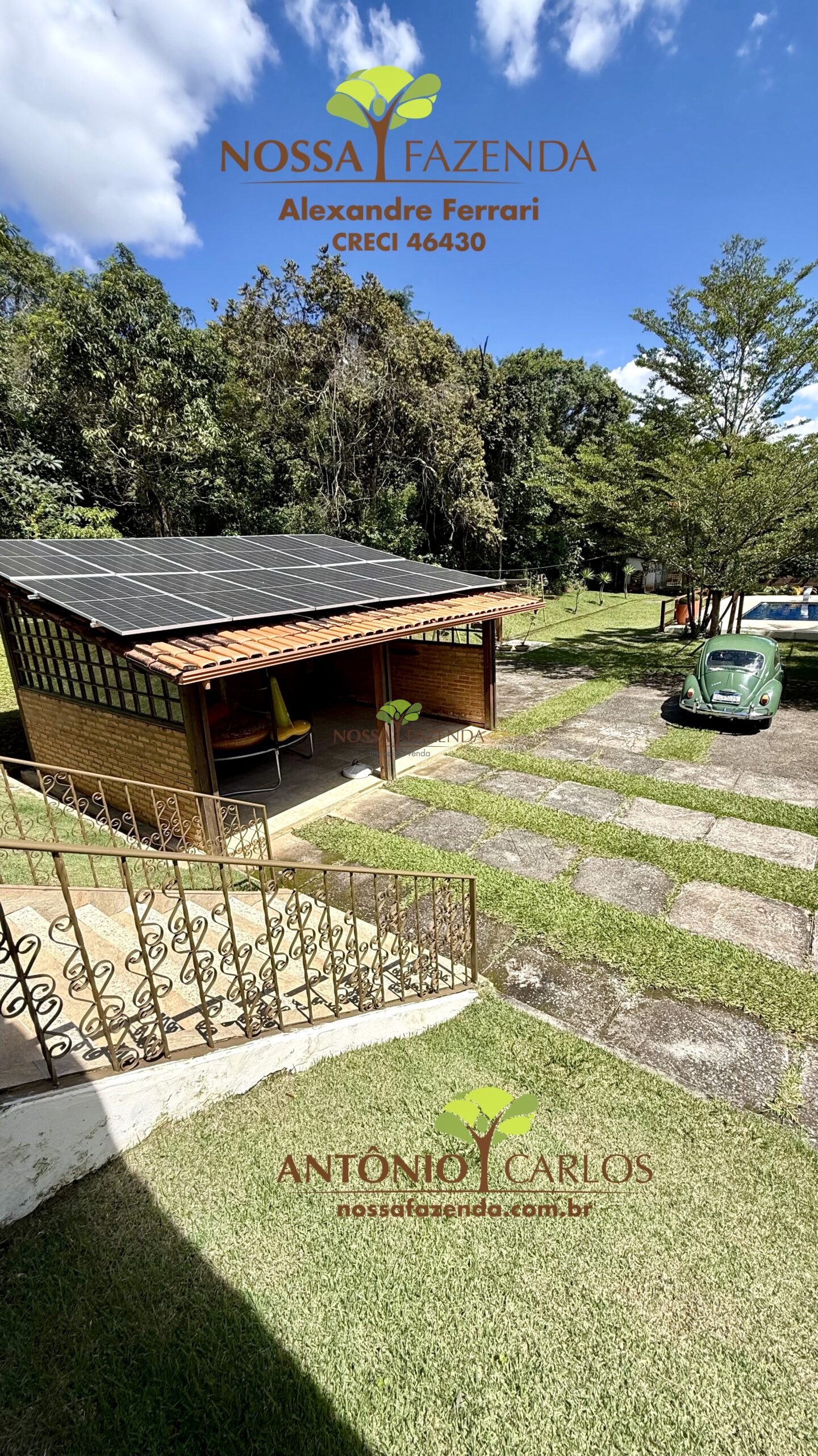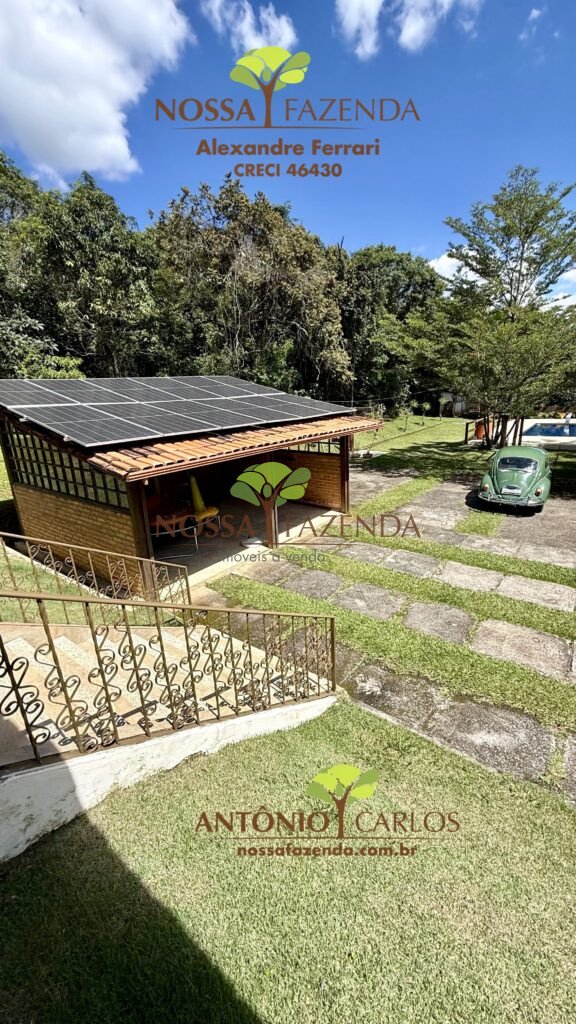 Lá fora garagem coberta para 2 veículos e descoberta para vários veículos, acima dela uma usina fotovoltaica que gera mais de 1 megawatts por mês deixando o custo de vida por aqui muito mais barato e sustentável.